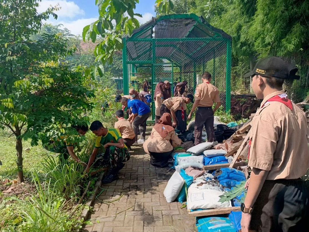 Denpal Divif 2 Kostrad mengajak guru dan siswa untuk bersama-sama melaksanakan pembersihan di lingkungan sekolah SMKN 1 Singosari Malang.