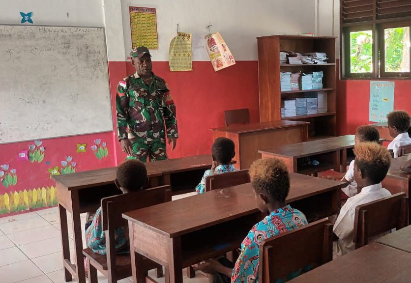 Indosiber.id – Timika – Dalam rangka menanamkan rasa cinta tanah air kepada generasi penerus guna meningkatkan wawasan, khususnya keikutsertaan dalam menjaga keutuhan Negara Kesatuan Republik Indonesia (NKRI) sejak dini, Bintara Pembina Desa (Babinsa) Koramil 1710-03/Kuala Kencana Koptu Alfaris Kumiyu berkoordinasi dengan guru untuk memberikan pembekalan materi Wawasan Kebangsaan kepada siswa-siswi SD YPPK ST. Yakobus di Kp. Iwaka, Distrik Iwaka, Kab. Mimika, Sabtu (20/01/2024).