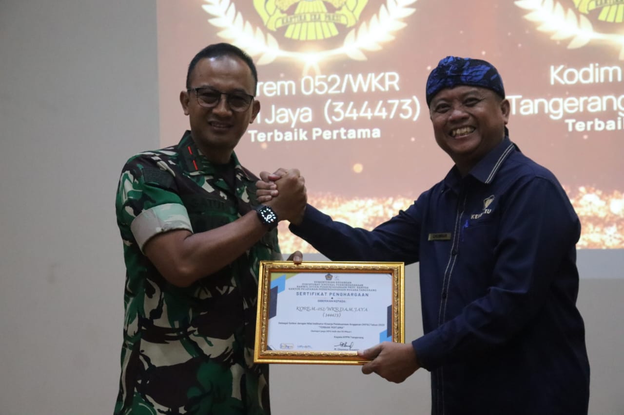 Pemberian penghargaan di terima langsung oleh Danrem 052/Wkr,Brigjen TNI Putranto Gatot SH,S.Sos.,M.M. yang di berikan kepala KPPN Tangerang M. Chonburi Susanto yaitu dengan mendapatkan dua penghargaan sekaligus berupa Sertifikat penghargaan “terbaik pertama” sebagai satker dengan penyerapan anggaran non belanja pegawai tahun 2023 kategori pagu dipa lebih dari 50 miliyar dan Sertifikat penghargaan “terbaik pertama” sebagai satker dengan nilai indikator kinerja pelaksanaaan anggaran (IKPA) tahun 2023 kategori pagu dipa lebih dari 50 miliyar, bertempat di Aula KPPN Tangerang lantai 2 Jalan TMP Taruna No.12 Kelurahan Sukaasih Kecamatan Tangerang Kota Tangerang.