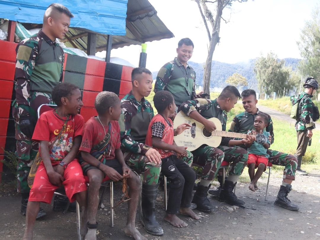 Indosiber.id – Jakarta. Para Prajurit Satgas Pamtas Mobile Yonif 330 Tri Dharma selalu punya cara untuk membuat anak-anak Intan Jaya merasa nyaman dan gembira ketika berada didekatnya. Kali ini, dengan berbekal sebuah gitar, para Ksatria Tri Dharma bercengkerama dan mengajak para Bocah Papua bernyanyi bersama, bertempat di Kampung Mamba, Distrik Sugapa, Kab. Intan Jaya, Papua Tengah, pada Kamis (07/03/2024).