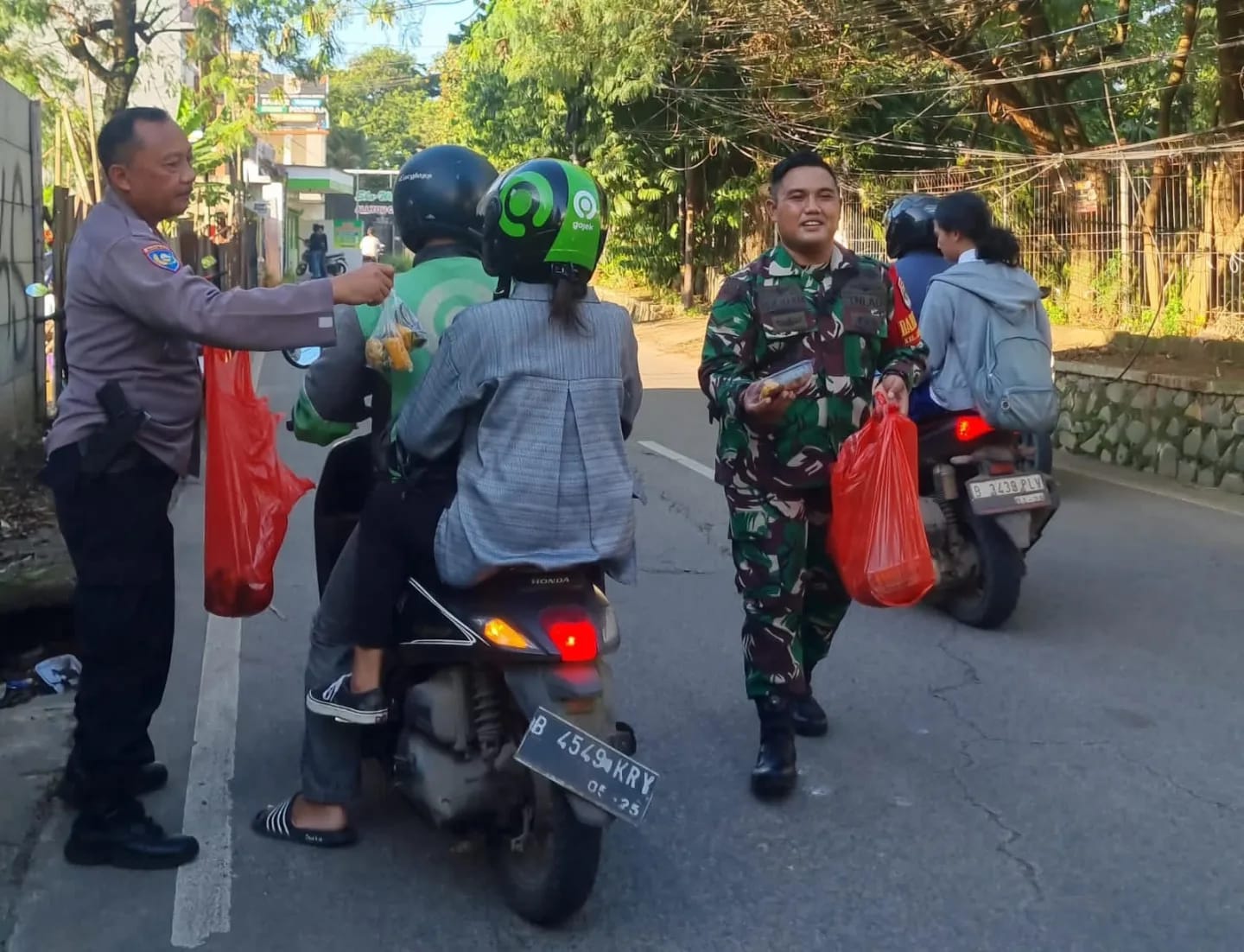 Indosiber.id – Kodam Jaya, Kota Bekasi – Guna berbagi kebahagian terhadap sesama, Serda Lilik Irawan Babinsa Koramil 02/Pondok Gede Kodim 0507/Bekasi bersama Bhabinkamtibmas Aiptu Suparno membagikan Takjil untuk buka puasa kepada pengguna jalan Rawa Dolar Rt 02 Rw 05 Kelurahan Jatiraden, Kecamatan Jatisampurna, Kota Bekasi, Selasa (19/3)