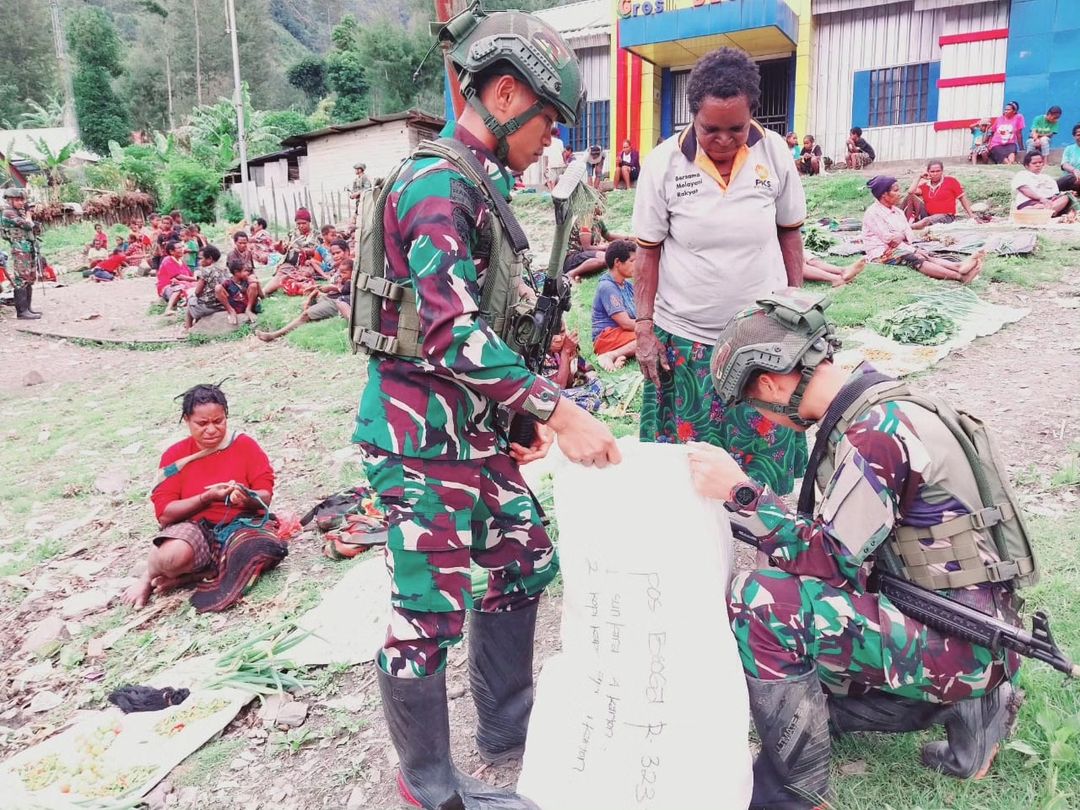 Mama-mama yang menjajakan sayur-sayuran, pisang, keladi, dan buah-buahan di depan Pos Beoga tidak hanya disambut oleh pembeli biasa, tetapi juga oleh prajurit TNI yang memborong barang dagangan mereka.