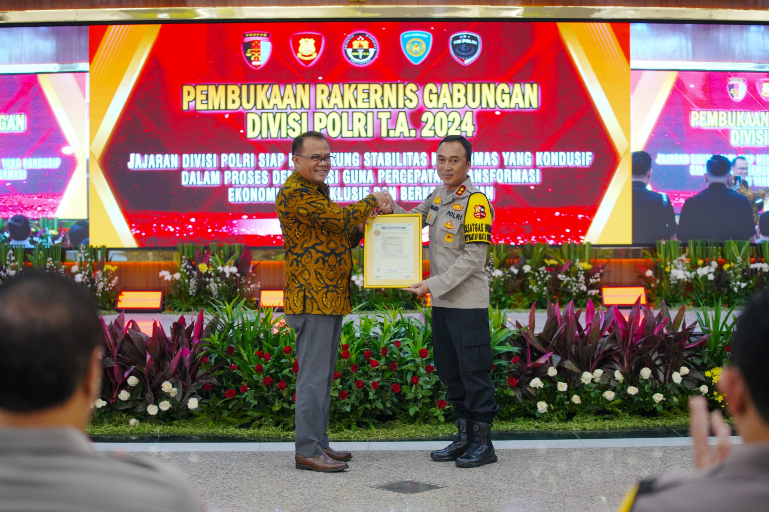 Indosiber.id – Kadivhumas Polri Irjen. Pol. Sandi Nugroho menerima penyerahan sertifikat ISO 9001:2015 yang diserahkan langsung oleh Vice President of corporate secretary PT Sucofindo Arifin SE. Penyerahan tersebut disaksikan langsung oleh Kapolri Jenderal Polisi Drs. Listyo Sigit Prabowo, PJU Mabes Polri dan Peserta Rakernis Satker divisi gabungan.