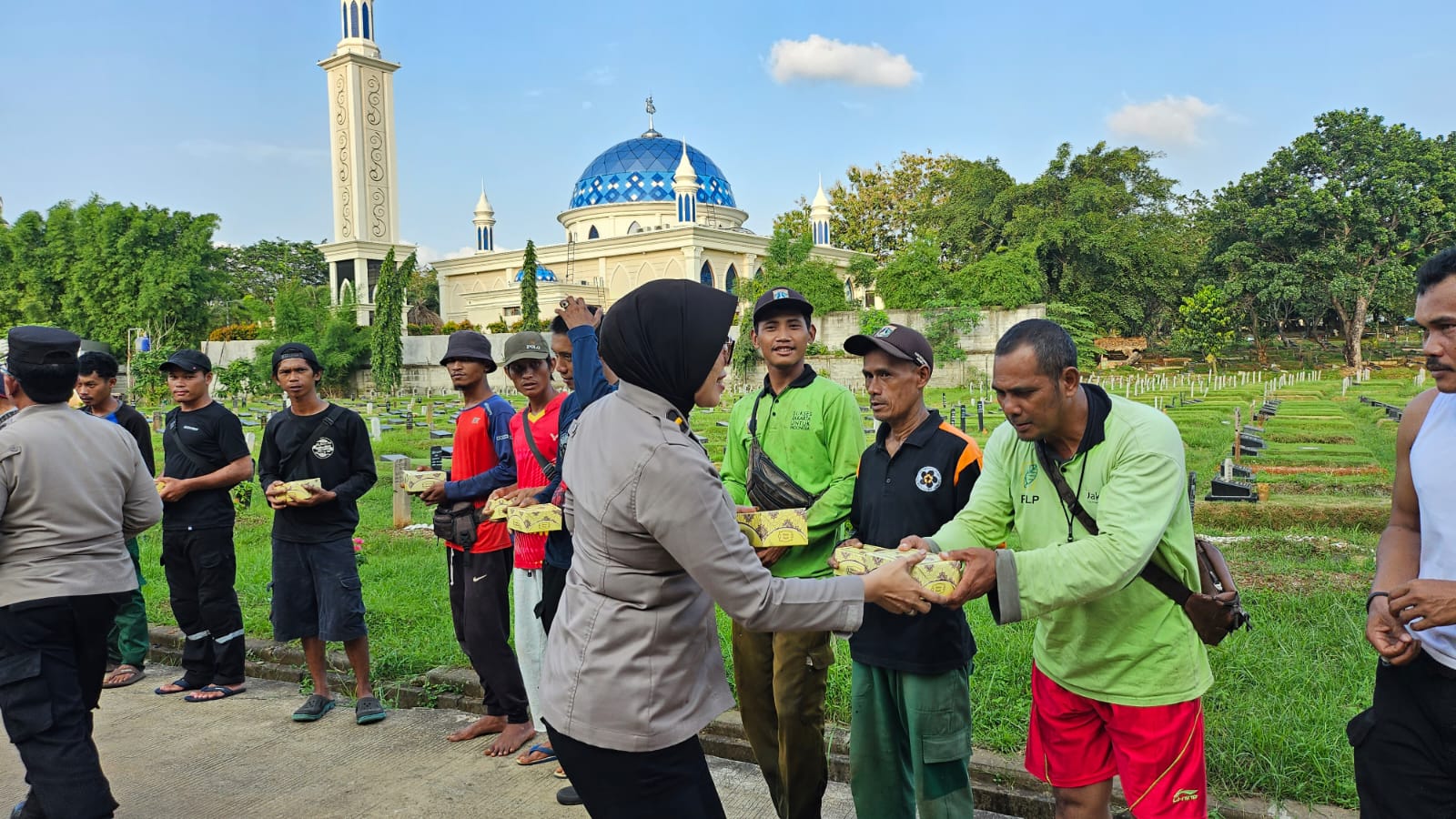 Kali ini Kapolsubsektor Gempol Iptu Ruslanto berikut Kasium Ipda Aan Amenah, Ka SPKT Ipda Yenny dan Bhabinkamtibmas Kelurahan Bambu Apus Aiptu Sahyudi membagikan makanan dan minuman untuk berbuka puasa kepada petugas penggali makam Kelurahan Bambu Apus Jakarta Timur.