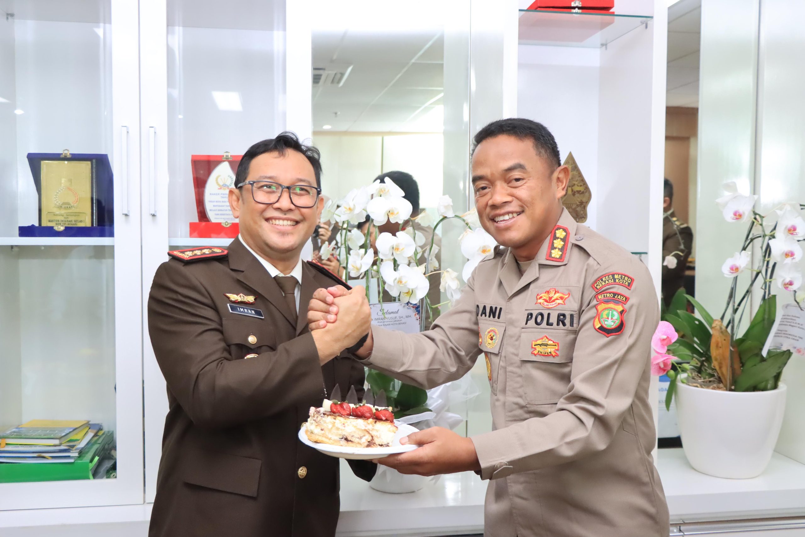 Dengan Momen HUT Adhyaksa ke-64, Kapolres Metro Bekasi Kota memberikan ucapan Selamat HUT Adhyaksa ke – 64 kepada Kajari Kota Bekasi Imran Yusuf, S.H., M.H. dan pemberian potongan kue bertuliskan HUT Adhyaksa ke – 64 dan pemotongan nasi tumpeng.