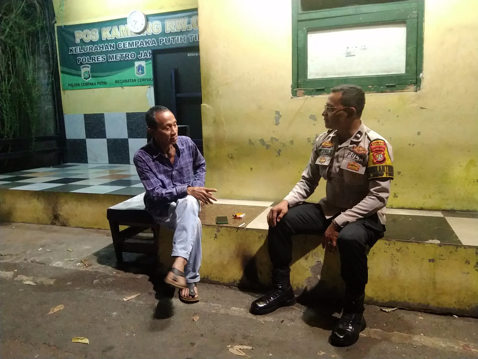 Indosiber.id – Jakarta Pusat – Bhabinkamtibmas Kelurahan Cempaka Putih Timur Aipda Wisnu Saputra melakukan sambang ke petugas siskamling di Jalan Cempaka Putih Timur 24 Cempaka Putih Jakarta Pusat. Minggu (11/8/2024)