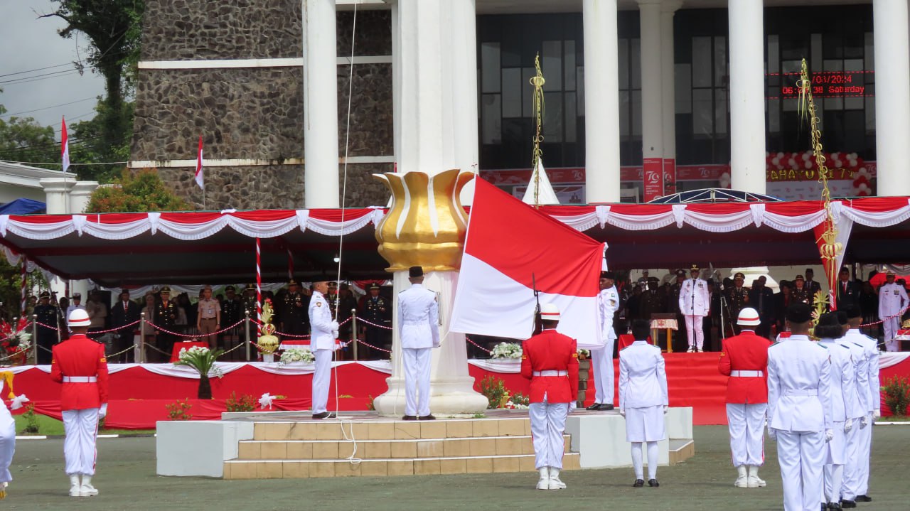 Dalam upacara tersebut juga dibacakan teks Proklamasi oleh Ketua DPRD Kabupaten Mimika, Bapak Anton Bukaleng, S.Sos., M.Si selanjutnya dilakukan pengibaran bendera merah putih oleh Paskibra yang terdiri dari siswa-siswi terbaik Kabupaten Mimika. Kegiatan pun diakhiri dengan parade paduan suara dan sesi foto bersama.