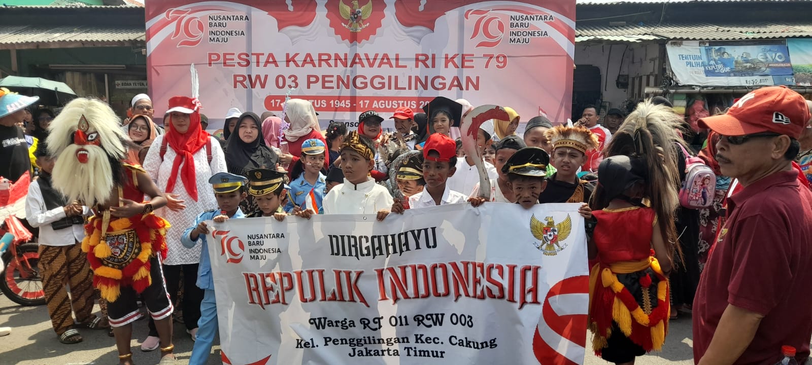 Ratusan warga dari 12 RT di RW 03 Penggilingan,Cakung, Jakarta Timur Bersama FBR Gardu 06 dan Jackmania Bona ikut memeriahkan kegiatan karnaval dalam rangka Hari Kemerdekan Republik Indonesia yang Ke 79.