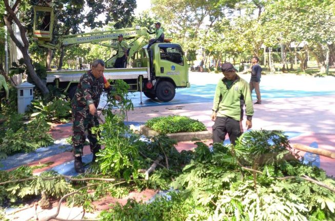 Indosiber.id – Menteng_Kondisi cuaca yang terkadang tidak menentu dan sering terjadinya hujan disertai angin kencang menimbulkan banyak kerawanan, terutama pohon tumbang. Mengantisipasi hal tersebut, Babinsa Koramil 01/Menteng Serka Kusnadi bersama Sudin Pertemanan laksanakan penopingan pohon, bertempat di Taman Menteng Jl. HOS. Cokroaminoto, RT.3/RW.5, Menteng, Kec. Menteng, Jakarta Pusat. Minggu (17/11/2024).