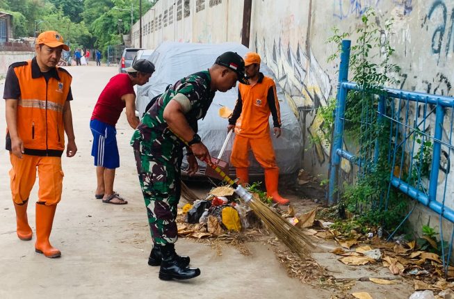 Indosiber.id – Kodim 0505/Jakarta Timur – Bertempat di Kampung Pegangsaan RT. 003 RW. 03 Kelurahan Rawaterate Kecamatan Cakung Jakarta Timur, Babinsa Koramil 06/Cakung, Pelda M. Idris dan Serda Daryanto bersama Warga di bantu anggota PPSU melaksanakan kegiatan karya bhakti pembersihan sampah yang menumpuk dan berserakan di jalan, Senin (30/12/24).