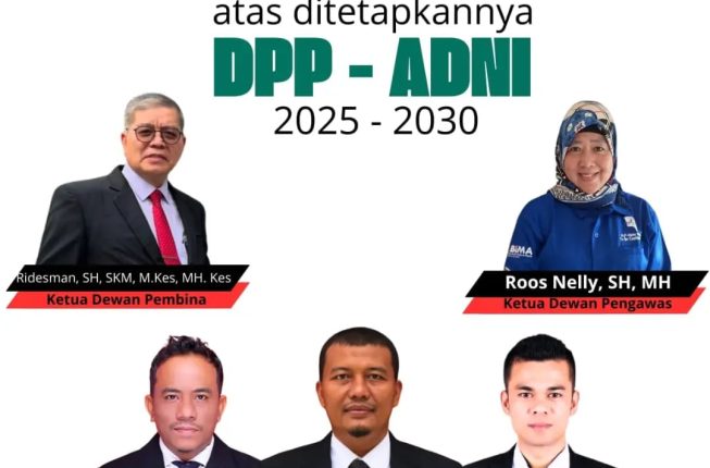 Berdasarkan surat pernyataan tanggal 4 Januari 2025 yang ditandatangani 6 orang dewan pendiri tersebut, Eka Putra Zakran, SH., MH ditetapkan sebagai Ketua Umum Dewan ex Officio Ketua Dewan Pendiri, Chairul Anwar Lubis, SH sebagai Sekretaris Jenderal, Adek Sikumbang, SH sebagai Bendahara Umum. Sementara itu, Ridesman, SH., SKM., M.Kes, MH.Kes ditetapkan sebagai Ketua Dewan Pembina dan Roos Nelly, SH., MH ditetapkan sebagai Ketua Dewan Pengawas. Disamping itu, anggota dewan pendiri juga memberikan mandat penuh kepada Eka Putra Zakran, SH., MH selaku Ketua Umum untuk menyusun komposisi DPP ADNI masa bakti 2025-2030, sesuai rumusan AD/ART bahwa 1 periode kepengurusan adalah 5 tahun.