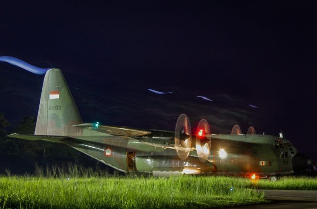 Indosiber.id – Makassar – Dua pesawat Hercules C-130H dari Skadron Udara 33 Lanud Sultan Hasanuddin membelah gelapnya malam langit Makassar, pada Selasa malam (11/2/2025). Di kokpit, redup cahaya hijau Night Vision Goggles (NVG), menyusup setiap detail medan yang dilaluinya.