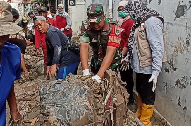 Babinsa Koramil 03/Teluk Pucung Bersama Aparat Kelurahan dan Warga Lanjutkan Kegiatan K3 Pembersihan Lumpur dan Sampah Pasca Banjir